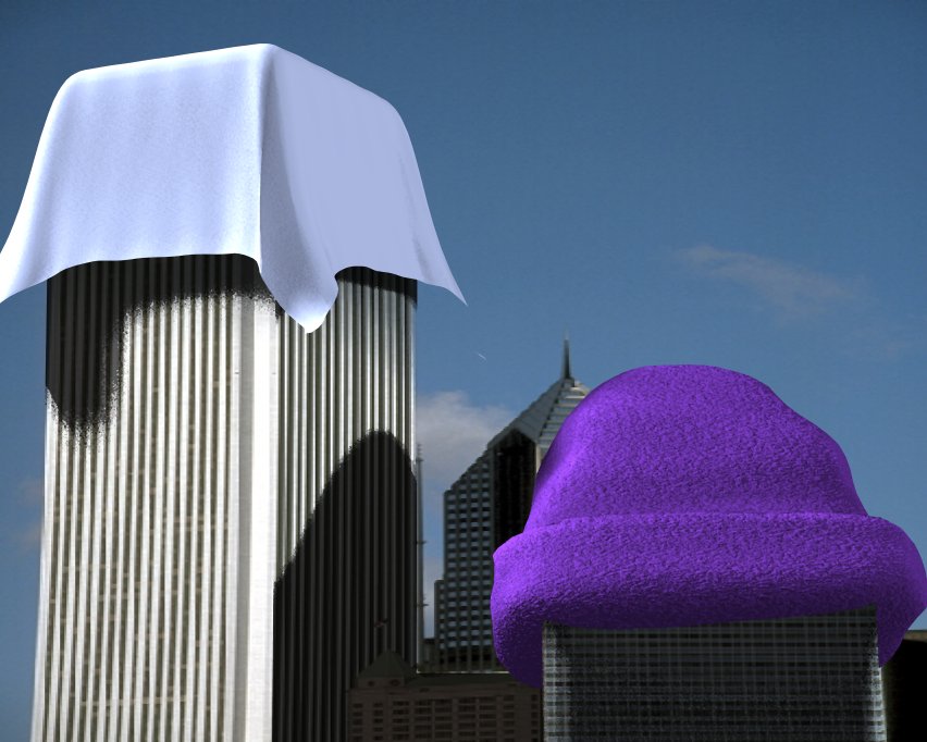 This odd scene uses cp4's catcher (for compositing over the background photo), and slide, for modeling the purple wool hat. The napkin on the more distinguished looking building is a